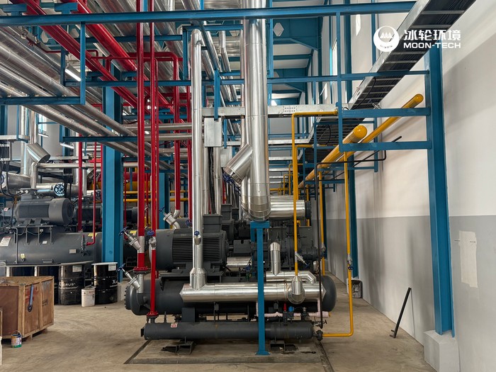 Ammonia System: Dual-stage screw compressors + evaporative condensers